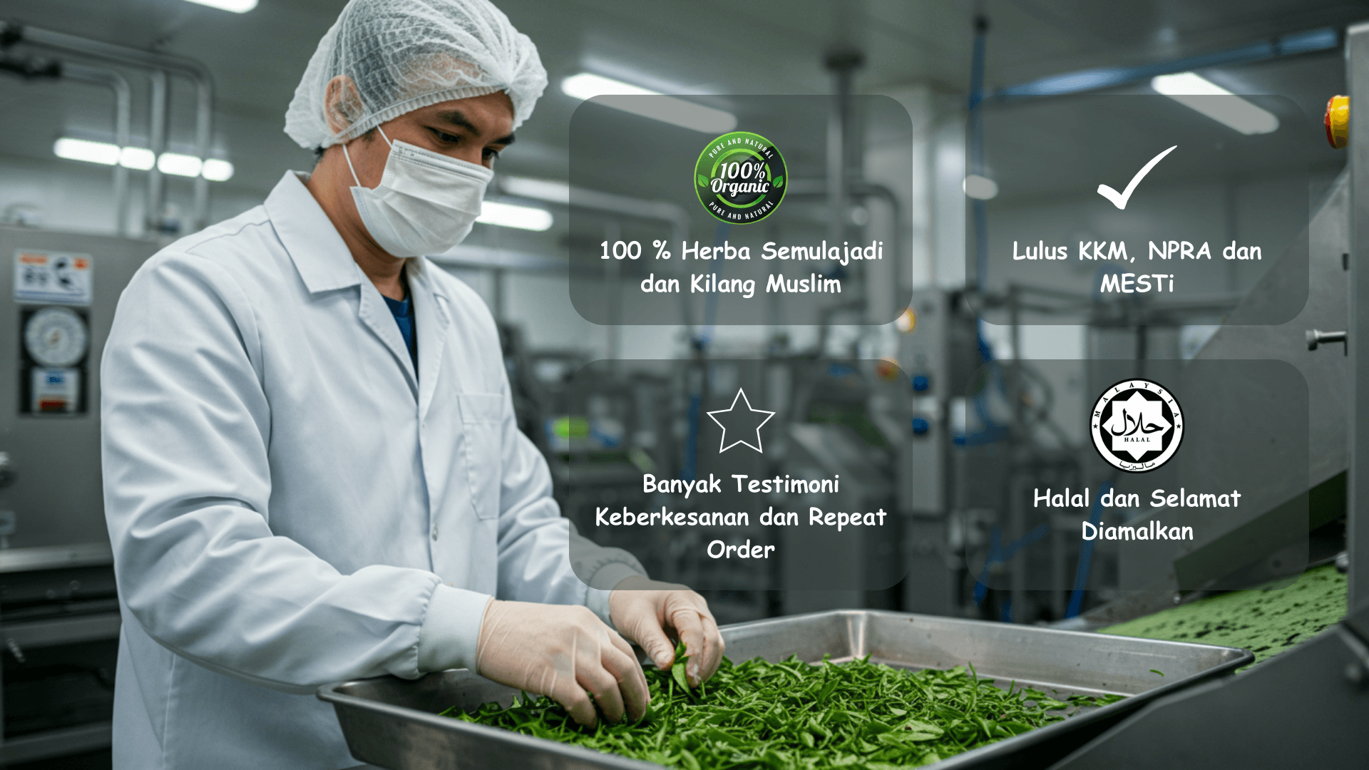 - Berdaftar dengan NPRA KKM, bahan asli semulajadi dihasilkan di kilang lengkap pensijilan MeSTI