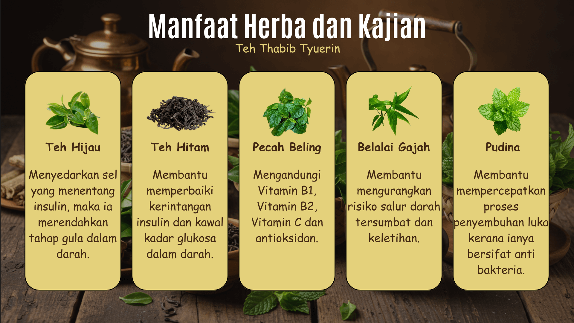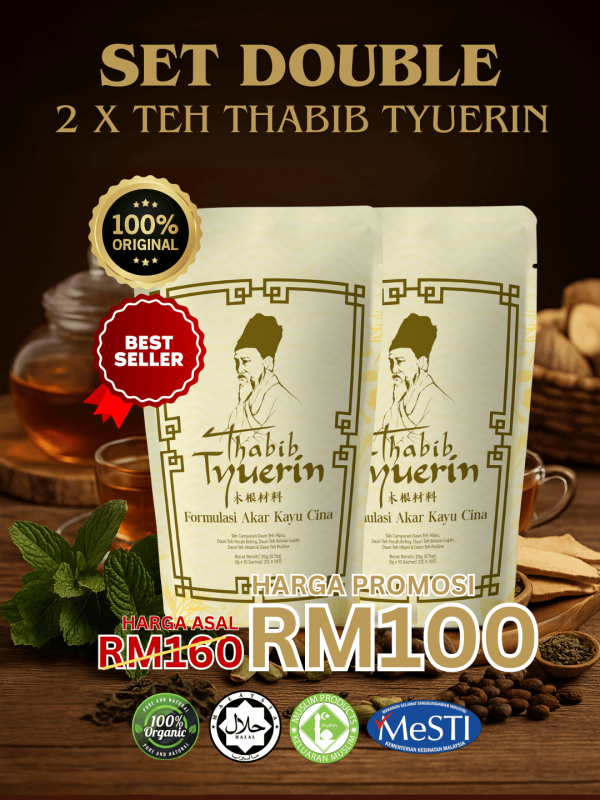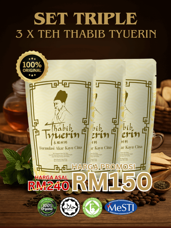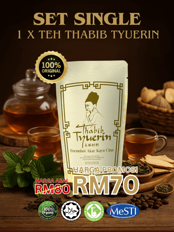 - Thabib Tyuerin mengandungi 5 herba premium, ada 2 sijil HALAL - Halal Produk dan Halal Pengilang.